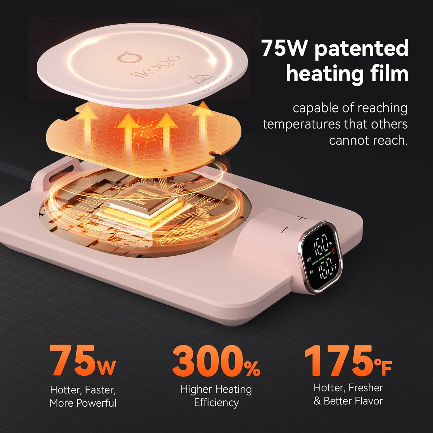Fast Heating & Energy Efficient: Powered at 75W, Ikago warmer heats 50% faster and reaches 175°F quickly. Smart power control maintains ideal warmth without overheating — saving energy while keeping every sip just right
